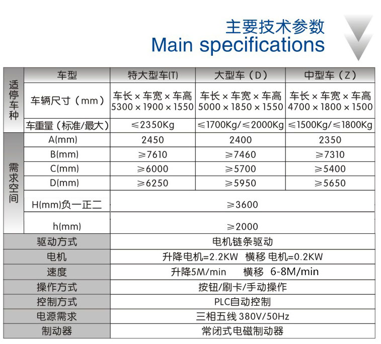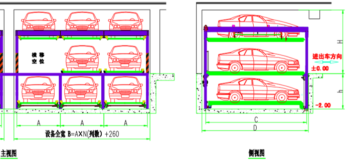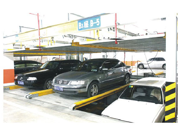 该设备的顶层载车板可上下升降;基坑层载车板可上下升降;地面层载车板做横移,地面层留有一个空位,可以通过横移载车板变换空位,使空位正上或下方的载车板下降或上升到地面层。地面层载车板上的汽车可直接出车,完成存取过程。